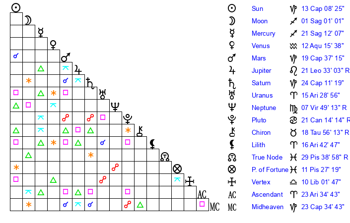 | Moon | 1 Sagittarius 6 | 14 Pisces 47 | 23 Aries 39 |