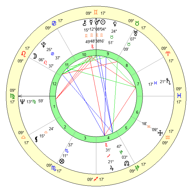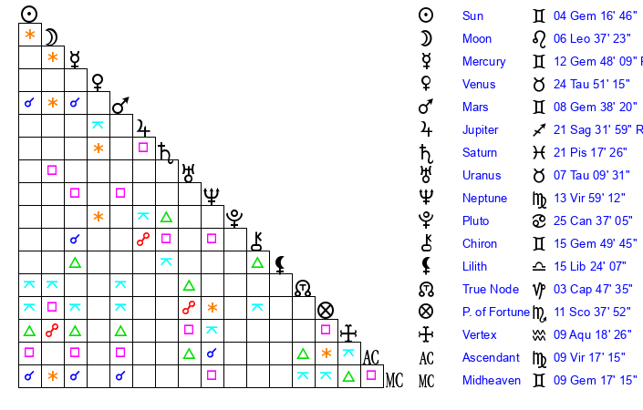 | Sun | 4 Gemini 16 | 4 Gemini 44 | 29 Leo 23 |