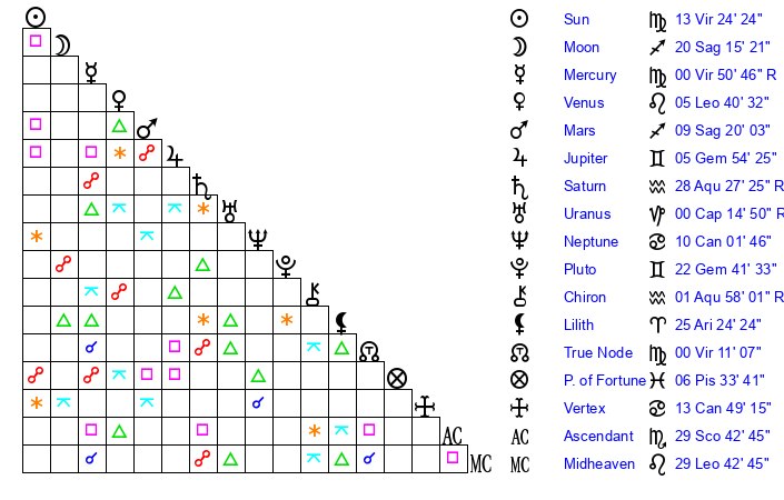 | Sun | 13 Virgo 24 | 14 Virgo 21 | 13 Capricorn 28 |