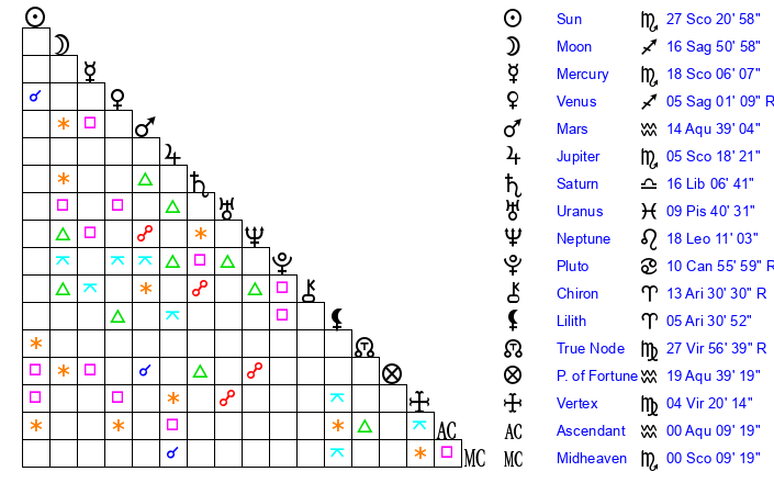 | Sun | 27 Scorpio 21 | 28 Scorpio 37 | 10 Pisces 51 |