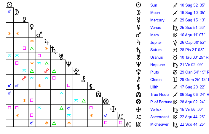| Sun | 10 Sagittarius 52 | 11 Sagittarius 32 | 10 Pisces 12 |