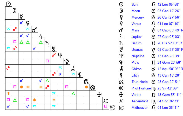 | Sun | 12 Leo 6 | 13 Leo 31 | 8 Sagittarius 22 |