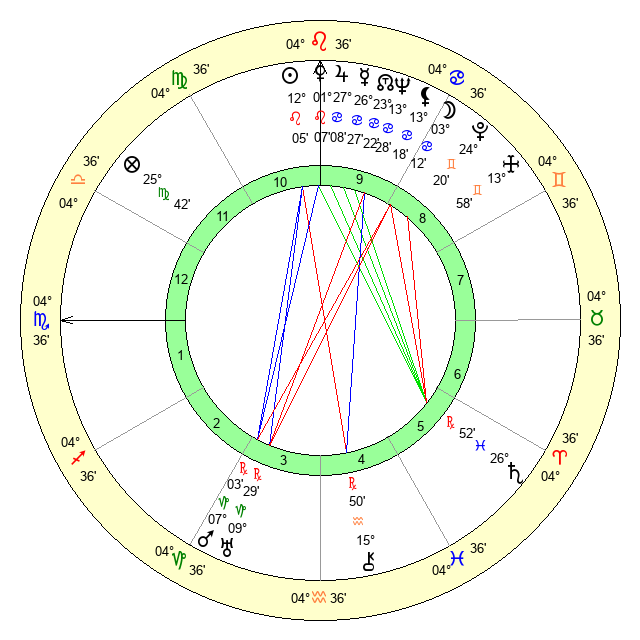 | Mercury | 26 Cancer 28 | 5 Leo 52 | 18 Scorpio 10 |
