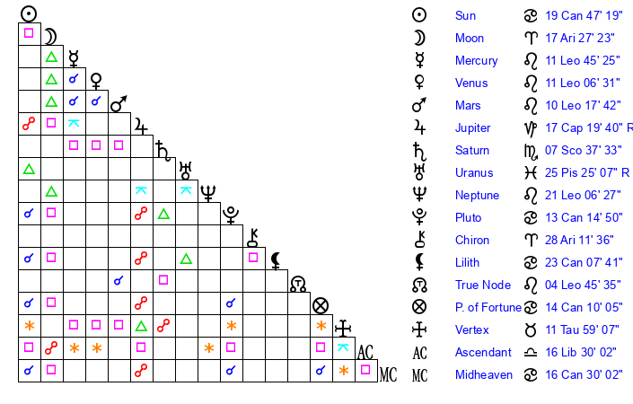 | Moon | 17 Aries 32 | 12 Aquarius 59 | 3 Sagittarius 51 |