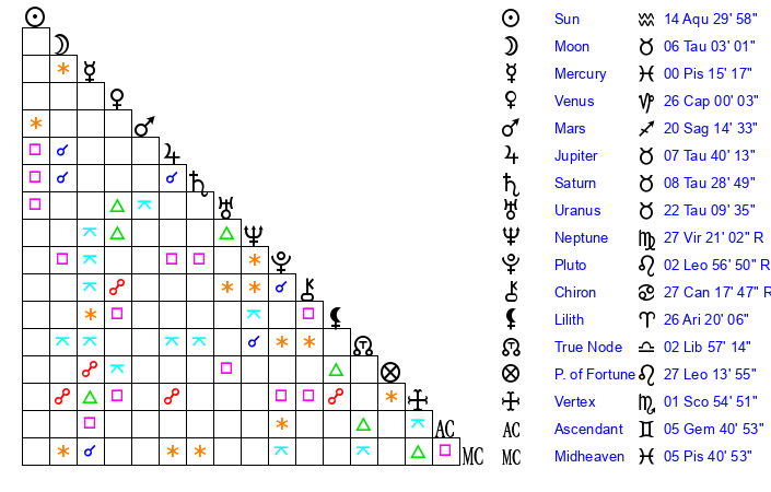 | Sun | 14 Aquarius 30 | 15 Aquarius 7 | 8 Taurus 0 |