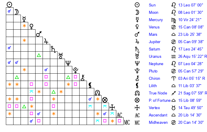 | Neptune | 7 Leo 5 | 1 Aries 53 | 9 Leo 18 |