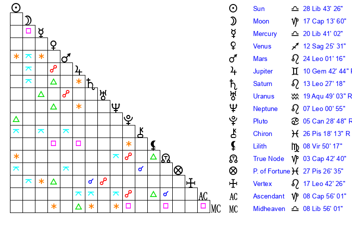 | Neptune | 7 Leo 1 | 29 Pisces 59 | 5 Leo 23 |