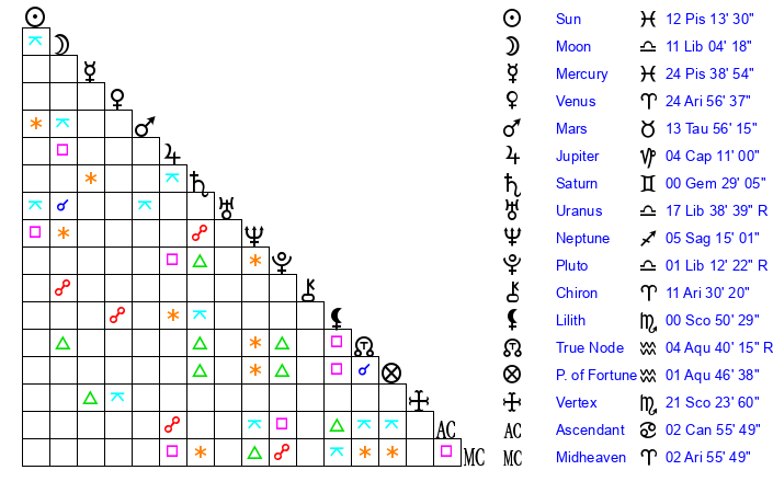 | Sun | 12 Pisces 13 | 12 Pisces 22 | 4 Taurus 36 |