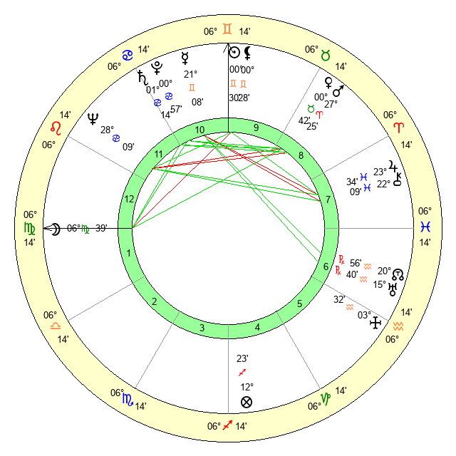 | Sun | 0 Gemini 30 | 1 Gemini 51 | 15 Virgo 55 |