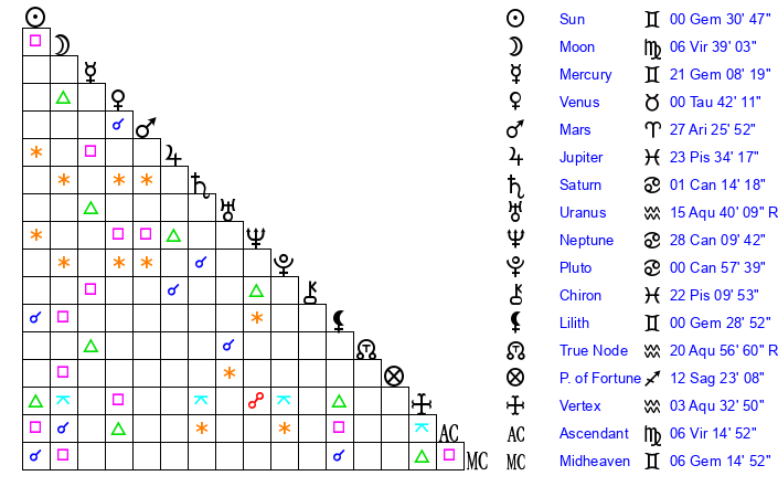 | Sun | 0 Gemini 30 | 1 Gemini 51 | 15 Virgo 55 |