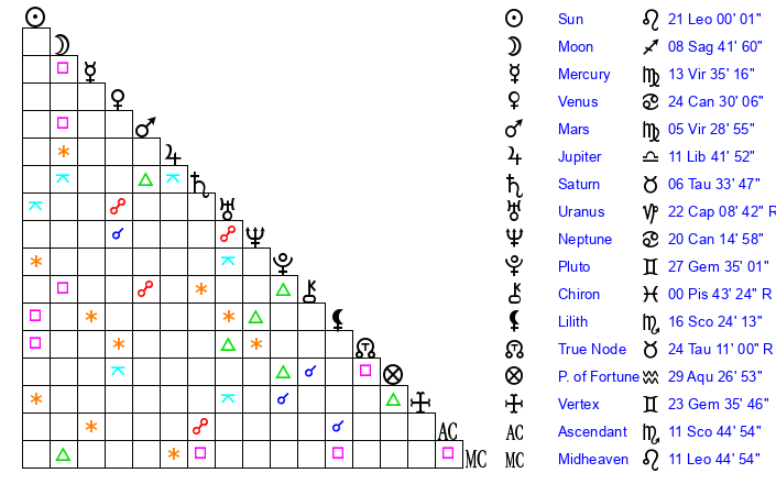 | Sun | 21 Leo 0 | 22 Leo 9 | 14 Sagittarius 44 |