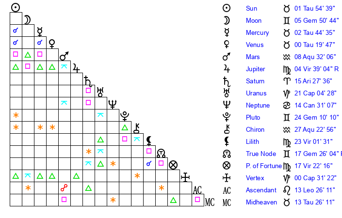 | Pluto | 24 Gemini 10 | 3 Aquarius 46 | 26 Gemini 35 |