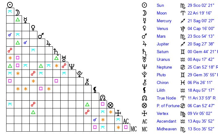 Sun | 29 Scorpio 2 | 29 Scorpio 53 | 22 Pisces 31 |