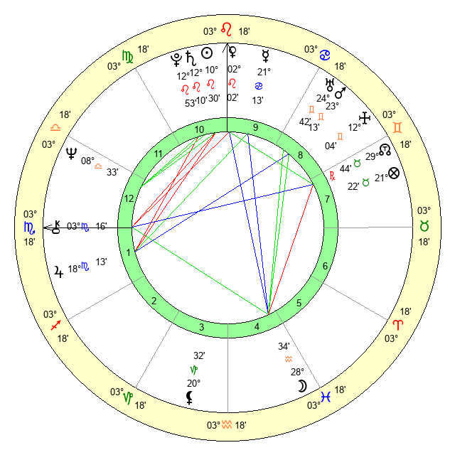 | Venus | 2 Leo 3 | 4 Cancer 6 | 8 Scorpio 54 |