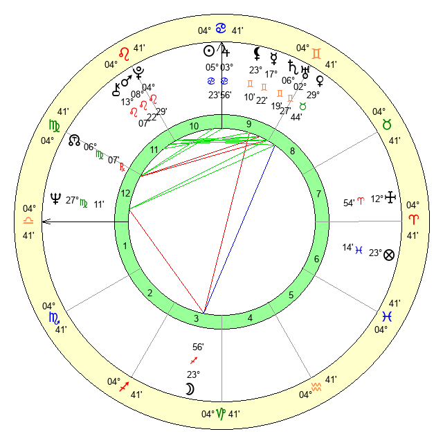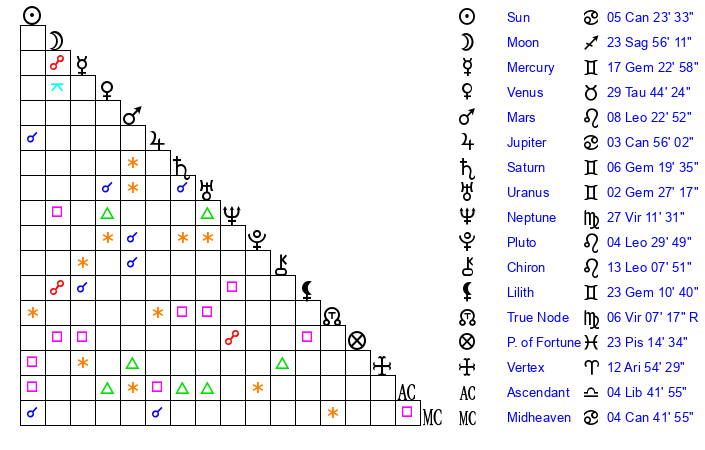 | Sun | 5 Cancer 23 | 6 Cancer 18 | 25 Virgo 8 |