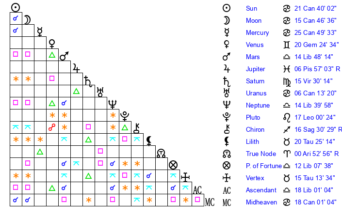 | Sun | 21 Cancer 40 | 22 Cancer 30 | 4 Libra 0 |