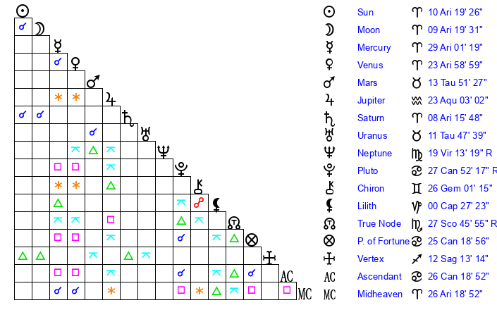 | Sun | 10 Aries 19 | 11 Aries 14 | 4 Cancer 24 |
