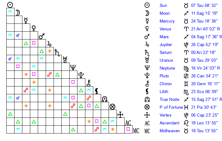 | Moon | 11 Sagittarius 11 | 21 Taurus 28 | 28 Aquarius 14 |