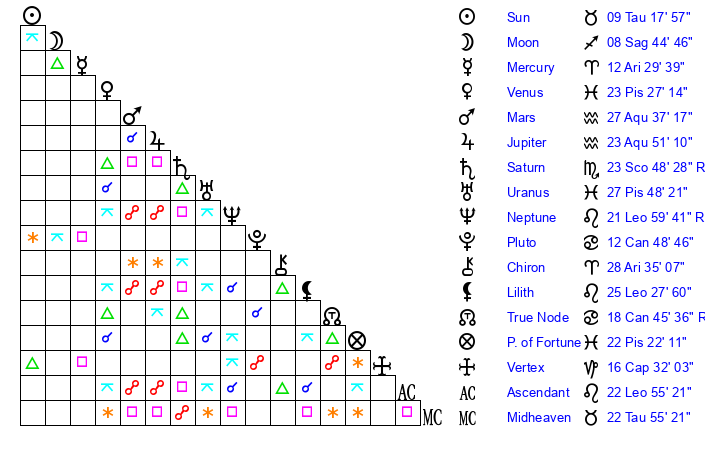 | Moon | 8 Sagittarius 49 | 17 Gemini 4 | 1 Leo 17 |