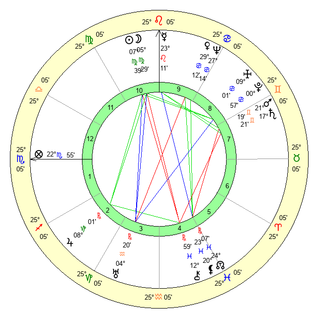 | Moon | 5 Virgo 25 | 13 Sagittarius 23 | 12 Libra 43 |