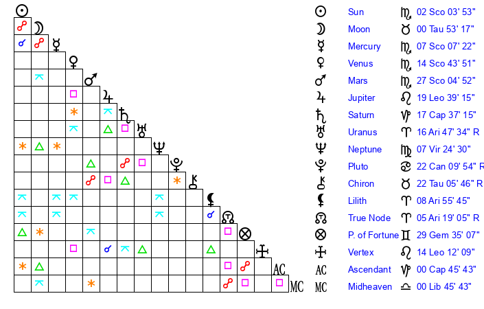 | Moon | 0 Taurus 58 | 27 Sagittarius 7 | 11 Libra 41 |