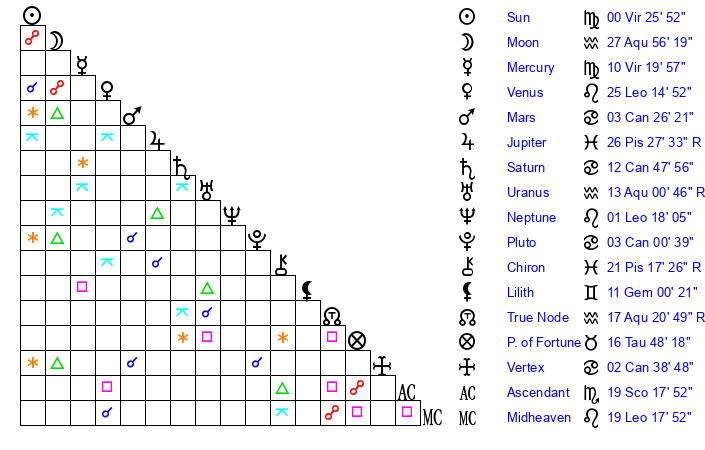 | Moon | 27 Aquarius 51 | 18 Virgo 54 | 10 Pisces 6 |