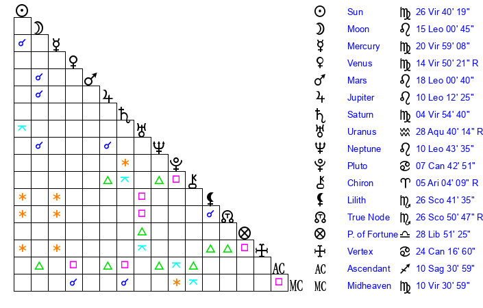 | Moon | 14 Leo 53 | 14 Virgo 58 | 26 Gemini 51 |