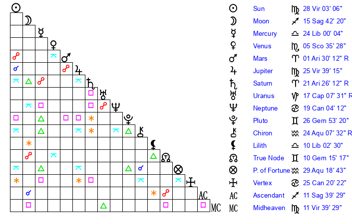 | Moon | 15 Sagittarius 42 | 27 Virgo 27 | 18 Pisces 50 |