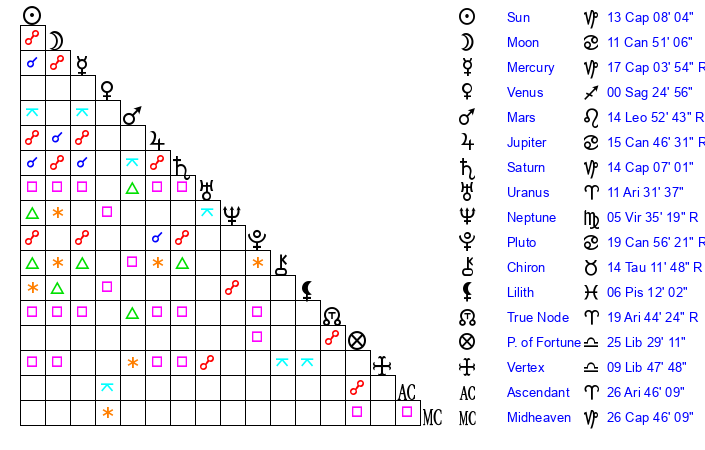 | Pluto | 19 Cancer 56 | 1 Aquarius 10 | 18 Cancer 42 |