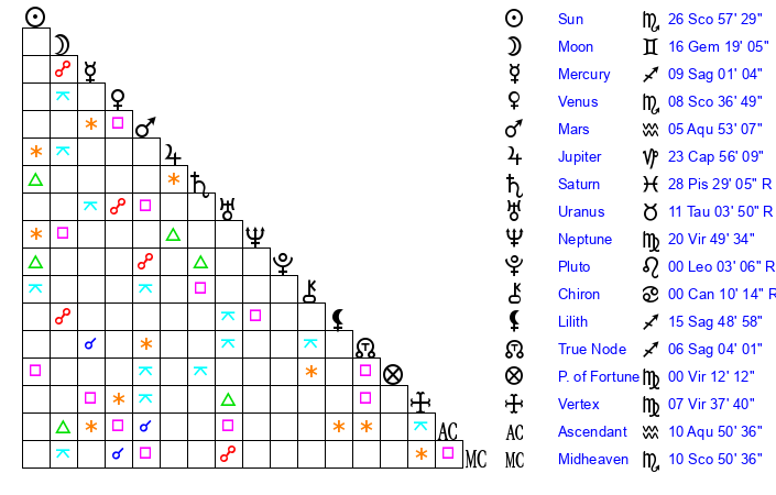 | Sun | 26 Scorpio 57 | 27 Scorpio 37 | 26 Aquarius 22 |
