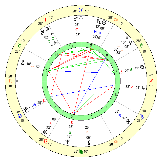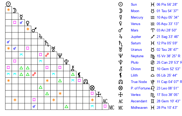 | Sun | 6 Pisces 56 | 8 Pisces 21 | 4 Gemini 16 |