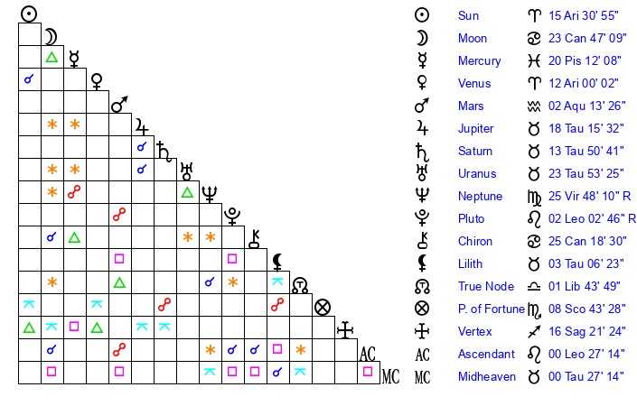 | Sun | 15 Aries 31 | 16 Aries 9 | 6 Cancer 34 |