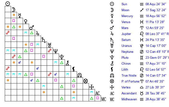 | Moon | 17 Sagittarius 41 | 12 Aquarius 20 | 9 Aries 10 |