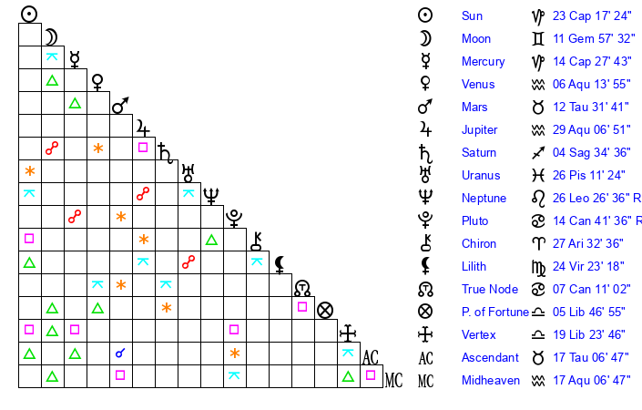 | Jupiter | 29 Aquarius 3 | 12 Gemini 0 | 21 Pisces 53 |