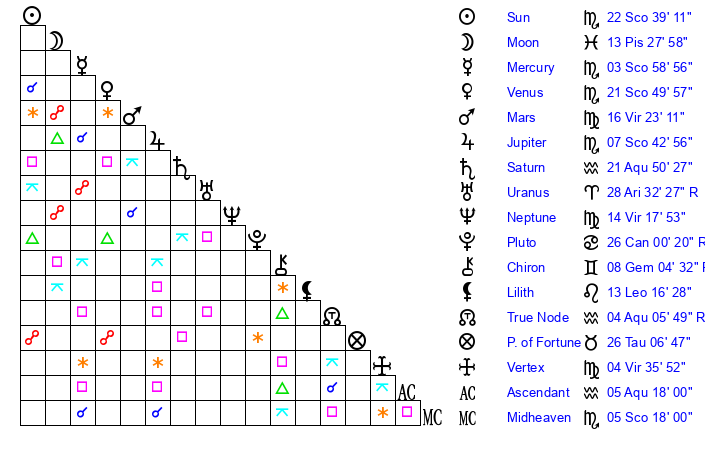 | Venus | 21 Scorpio 50 | 10 Scorpio 59 | 15 Pisces 58 |
