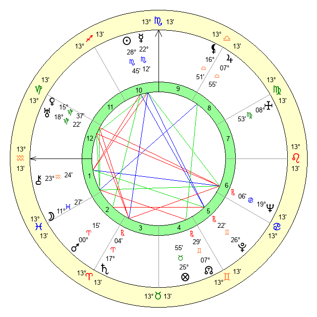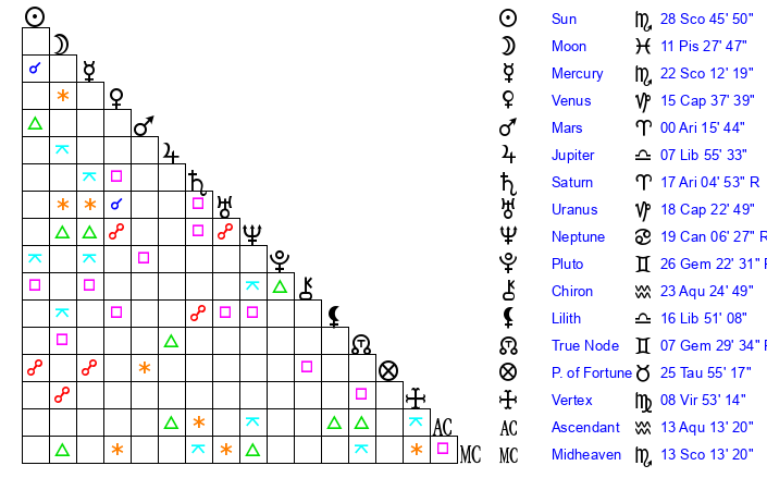 | Sun | 28 Scorpio 46 | 29 Scorpio 53 | 25 Pisces 14 |