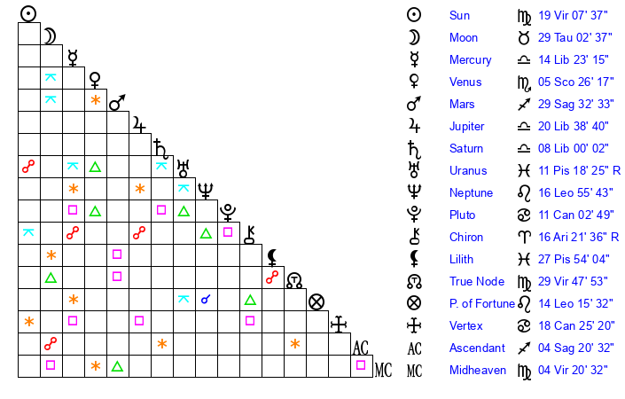 | Sun | 19 Virgo 8 | 20 Virgo 11 | 2 Capricorn 7 |