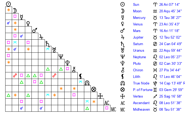 | Sun | 26 Aries 7 | 26 Aries 57 | 9 Leo 47 |