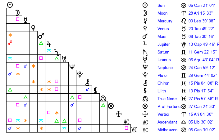 | Saturn | 11 Gemini 59 | 1 Aries 39 | 18 Gemini 36 |