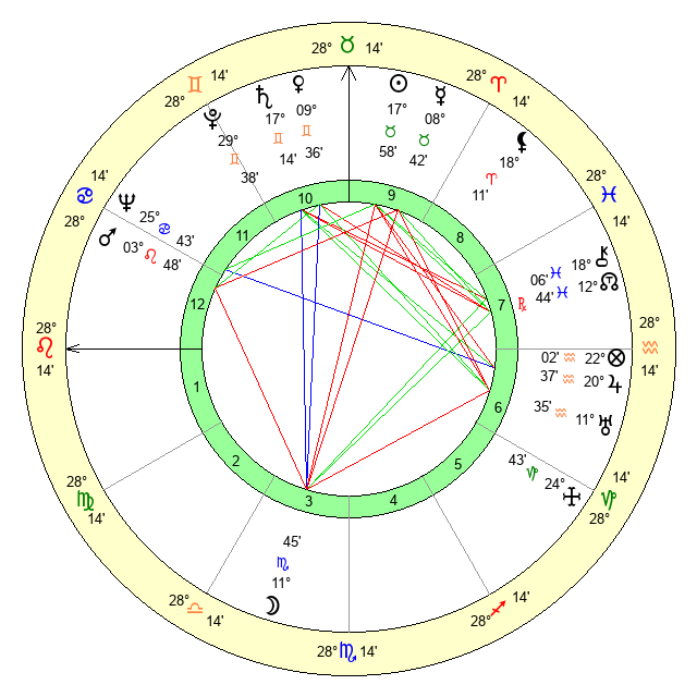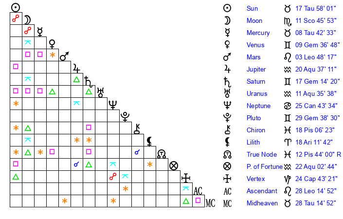 | Moon | 11 Scorpio 54 | 13 Libra 42 | 7 Sagittarius 36 |