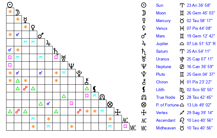 | Sun | 23 Aries 37 | 24 Aries 45 | 14 Leo 2 |