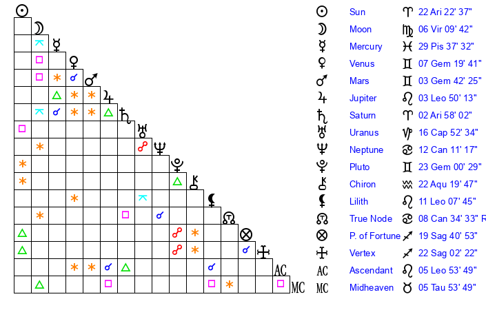| Sun | 22 Aries 23 | 23 Aries 2 | 14 Leo 45 |