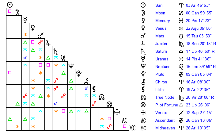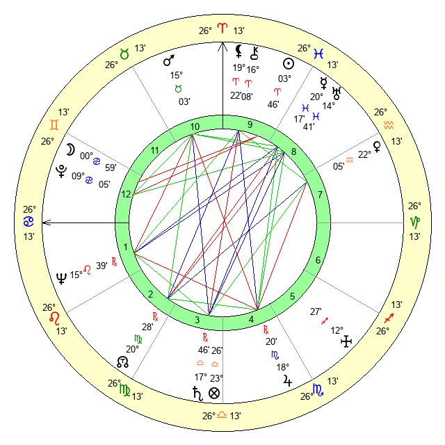 | Sun | 3 Aries 47 | 5 Aries 3 | 12 Cancer 23 |