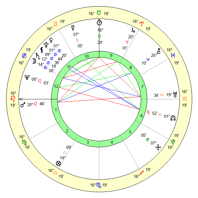 | Moon | 14 Cancer 16 | 19 Virgo 29 | 13 Cancer 38 |