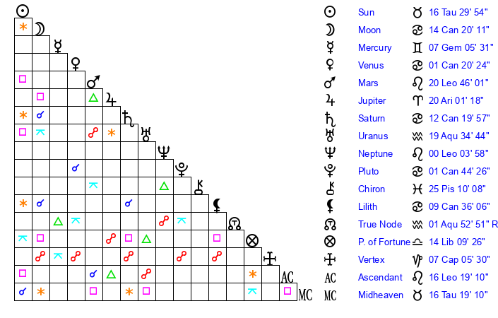 | Moon | 14 Cancer 16 | 19 Virgo 29 | 13 Cancer 38 |