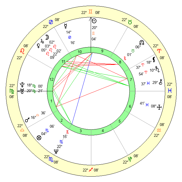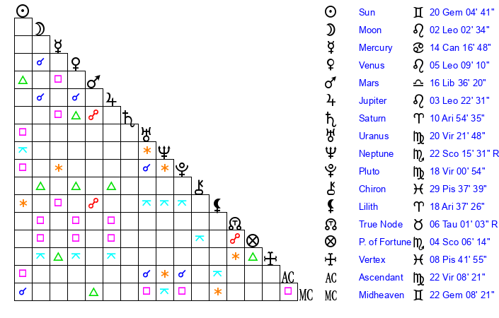 Sun | 20 Gemini 5 | 21 Gemini 1 | 15 Leo 27 |