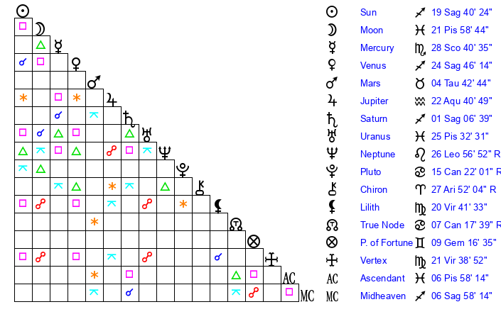 | Saturn | 1 Sagittarius 32 | 13 Pisces 15 | 8 Sagittarius 6 |