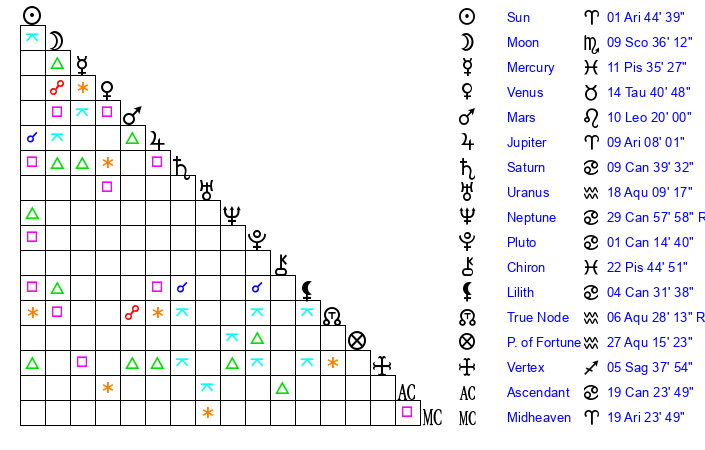 | Moon | 9 Scorpio 36 | 4 Capricorn 46 | 1 Scorpio 59 |