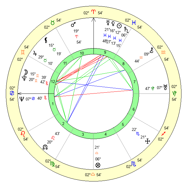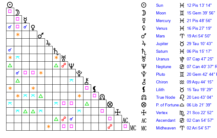 | Sun | 12 Pisces 13 | 13 Pisces 22 | 7 Cancer 58 |