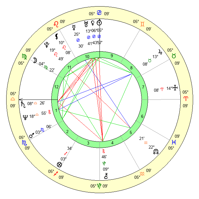 | Sun | 5 Cancer 57 | 6 Cancer 18 | 15 Virgo 58 |